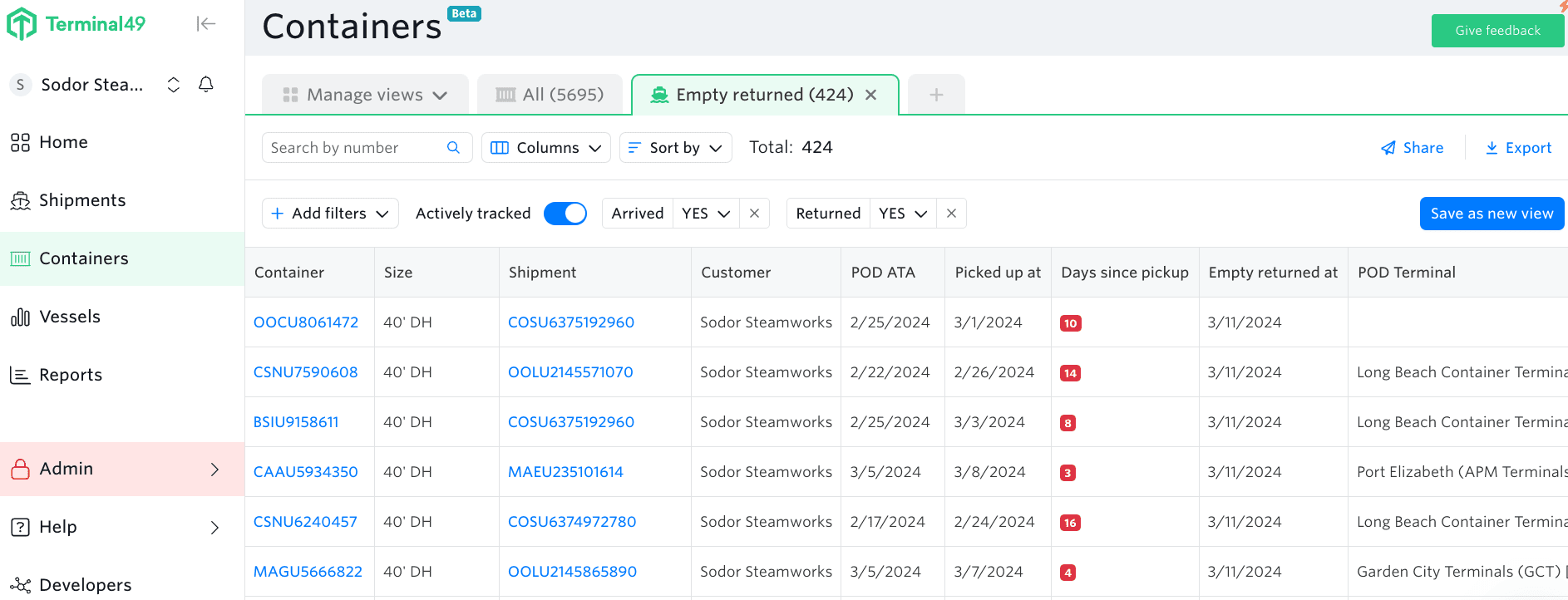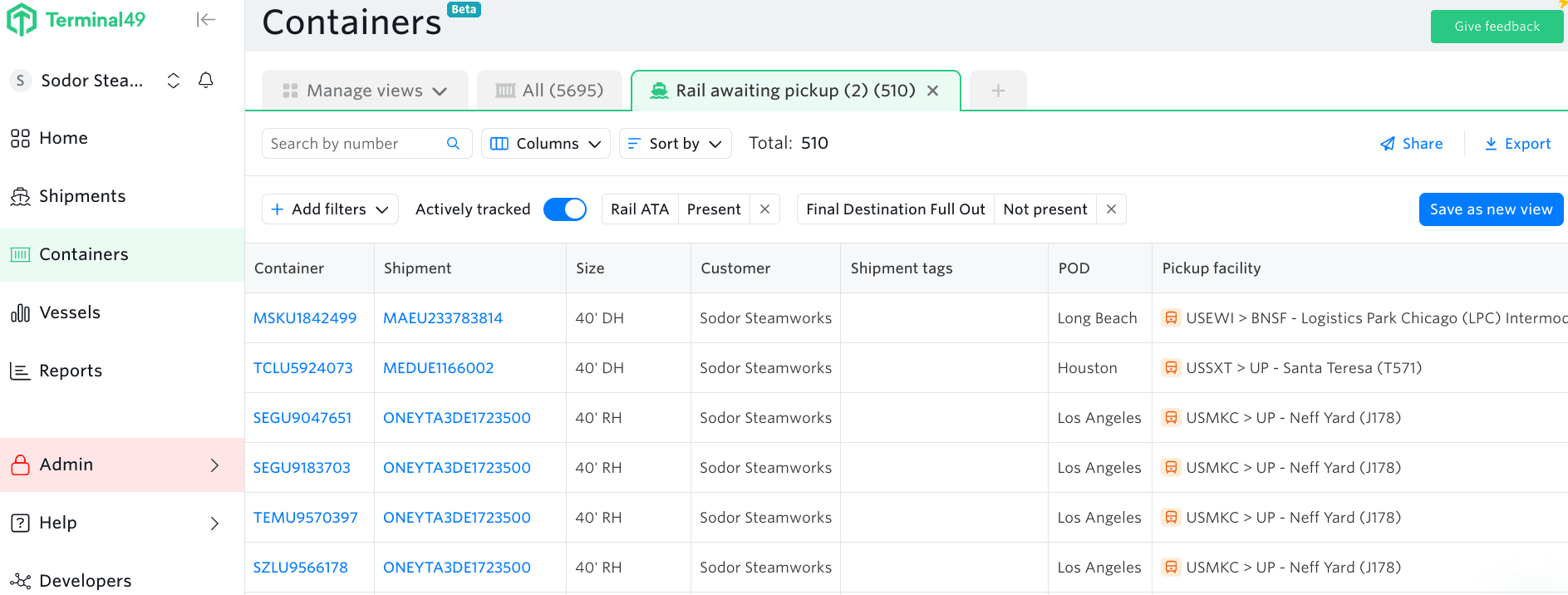 - Dashboard: We have additional container dashboard views that makes it easy to manage rail containers via a single dashboard on Terminal49.