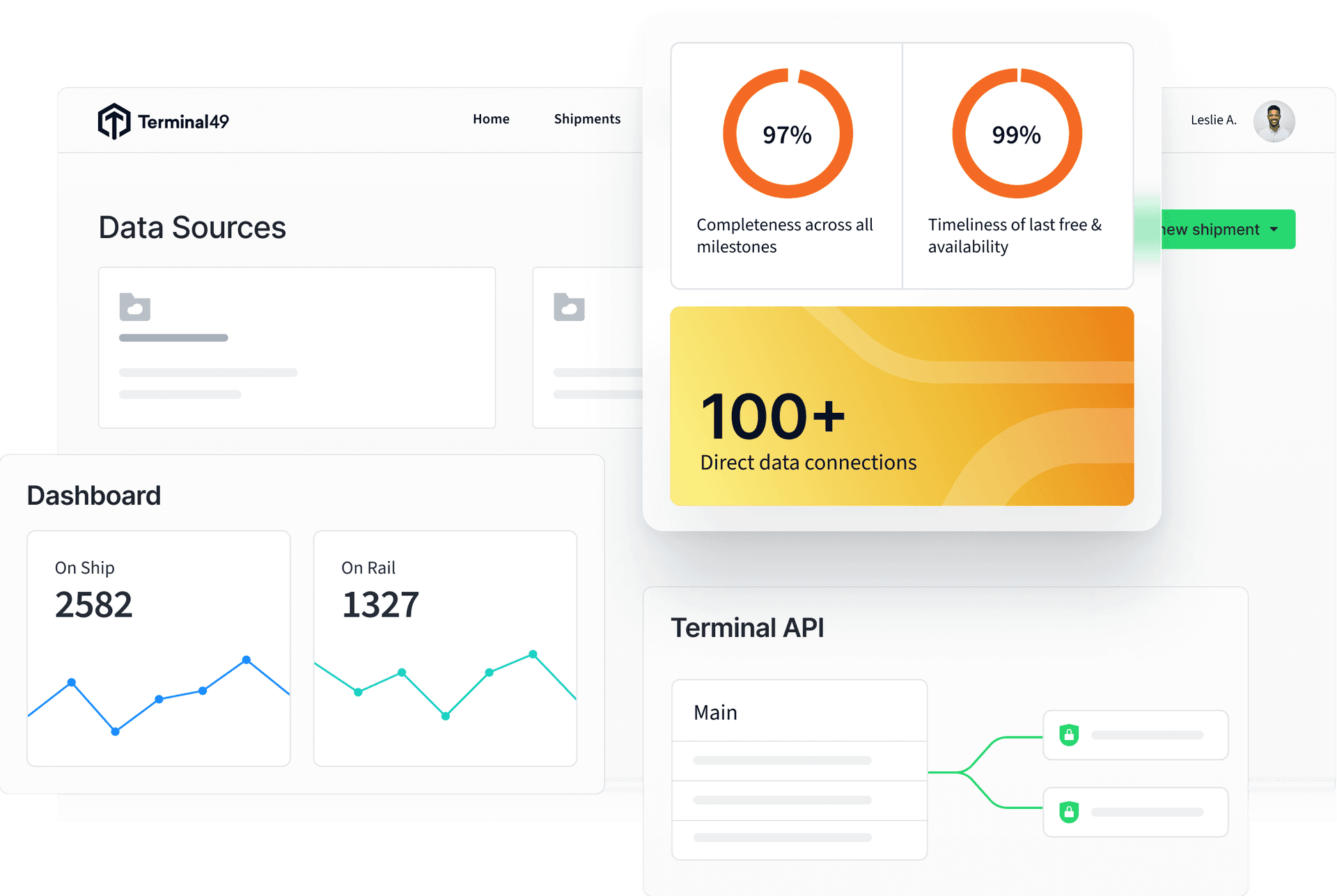 With Terminal49, you get complete visibility into every container’s journey, from ocean to inland. We bring together standardized data from hundreds of reliable sources—including shipping lines, terminals, and rail carriers—into one easy-to-use platform, which you can access via our API or Dashboard.