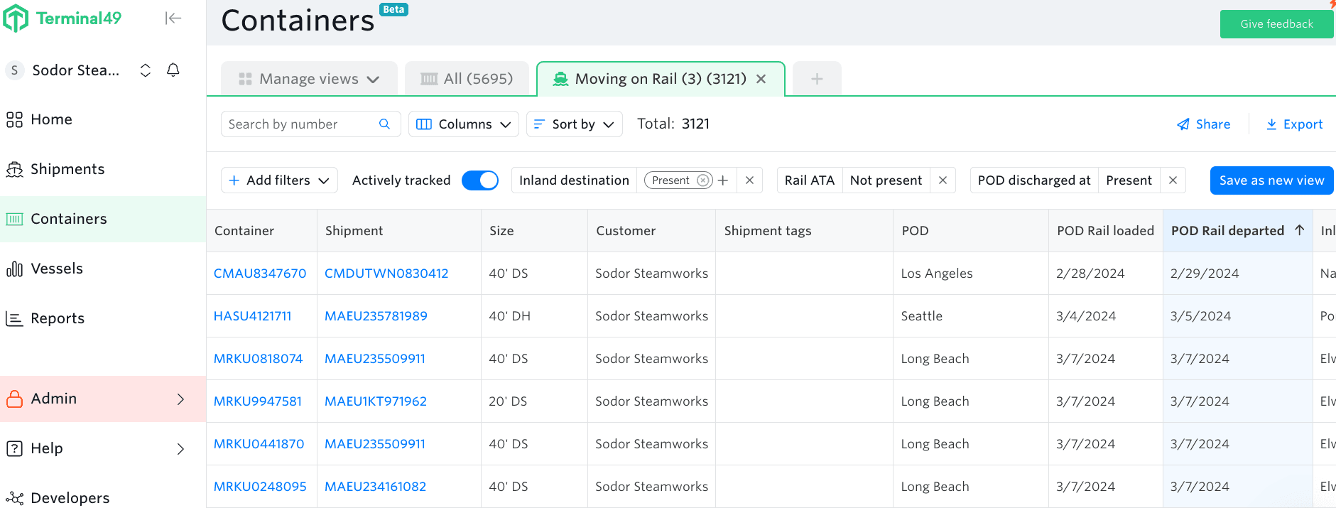 - Dashboard: We have additional container dashboard views that makes it easy to manage rail containers via a single dashboard on Terminal49.